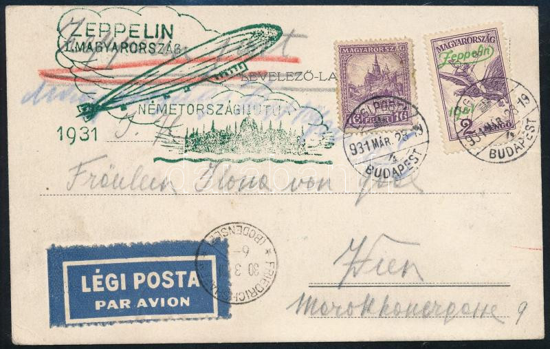 1931 Zeppelin I. Magyarország-Németország útja légi levelezőlap, Zeppe...