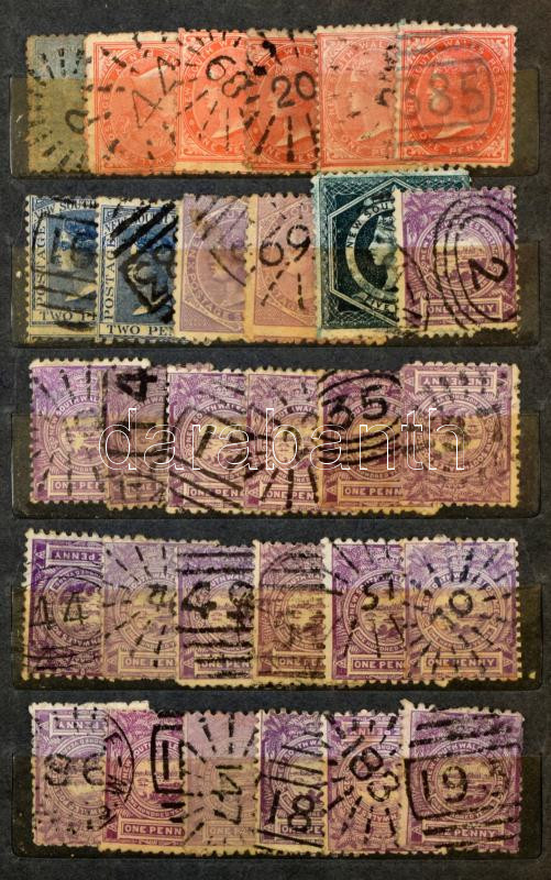 New South Wales (ausztrál elő állam) 1862-1905 214 db bélyeg klf postaazonosító számbélyegzővel, 4 lapos kis berakóban
