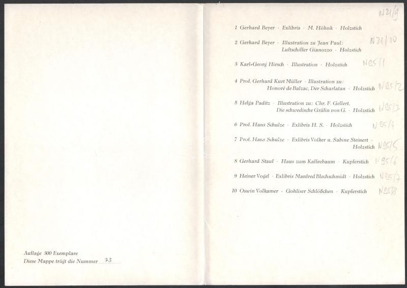 Description: 1970 Klf. alkotók (Gerhard Beyer, Karl-Georg Hirsch, Helga Paditz, stb.): XIII. Internationaler Exlibris Congress Budapest 1970. (A XIII. Nemzetközi Ex Libris Kongresszus alkalmából megjelent mappa, 10 db grafika). Vegyes technika, papír, mindegyik jelzett. Változó méretben. Kiadói papírmappában. Számozott (73./300) példány.