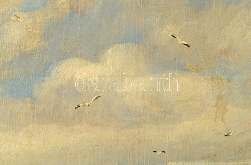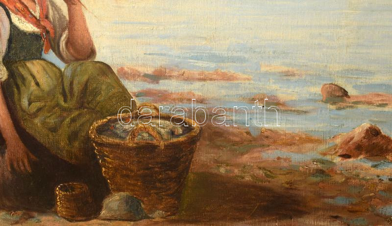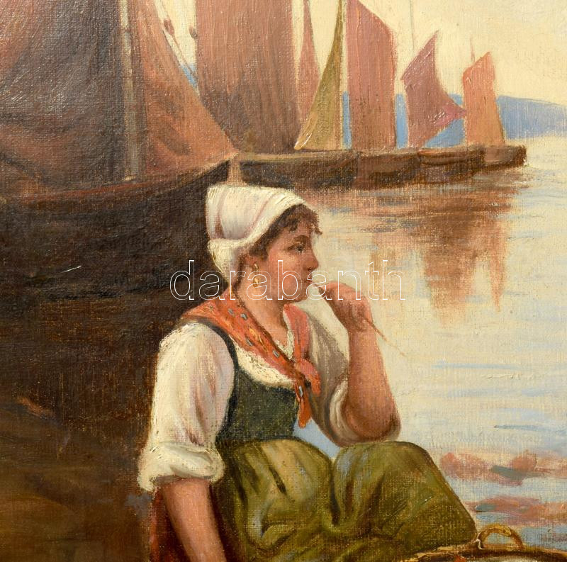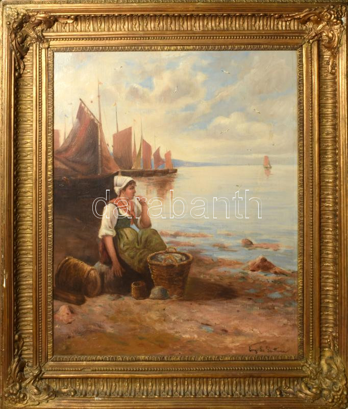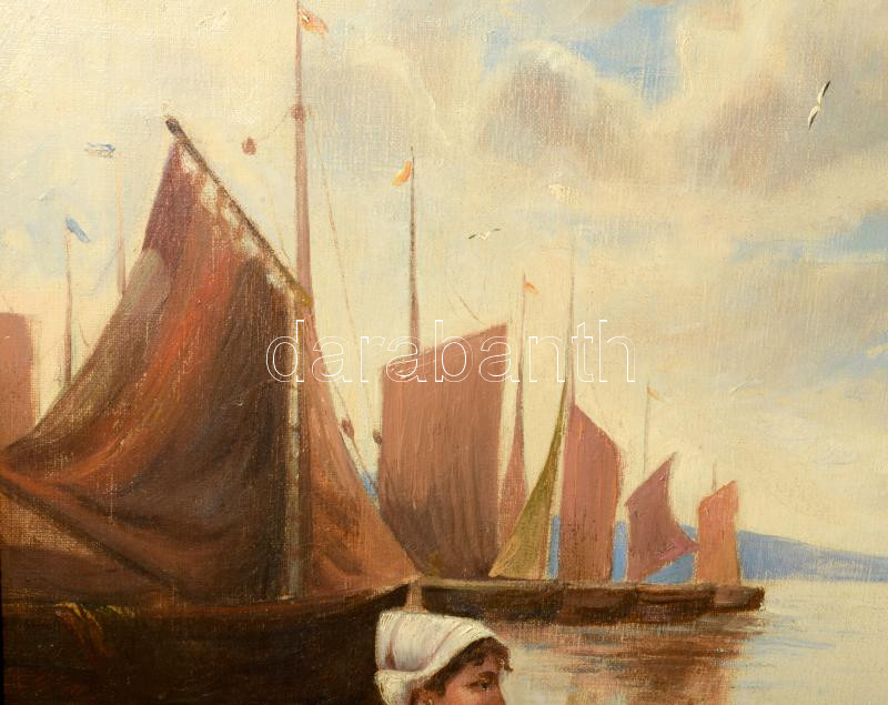 Eugen Le Potterin (?) jelzéssel: Tengerparti jelenet vitorlásokkal és hölggyel. Olaj, vászon. Dekoratív, kissé sérült fakeretben, 69×55 cm
