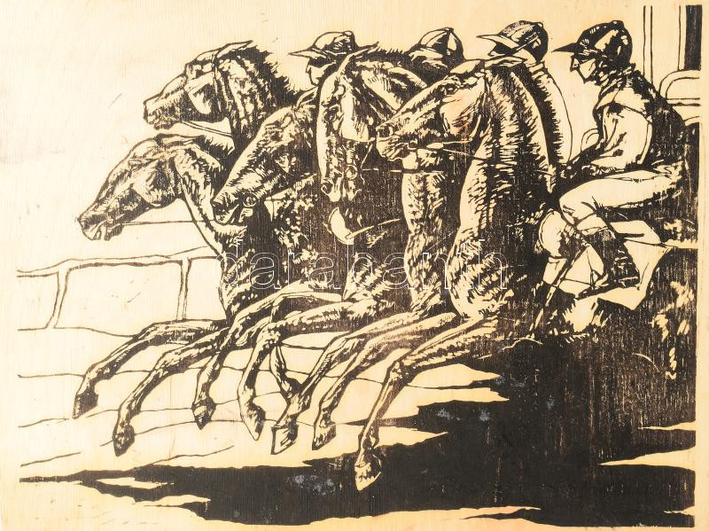 Jelzés nélkül: Lóverseny. Szitanyomat. Fa. 27x36 cm.