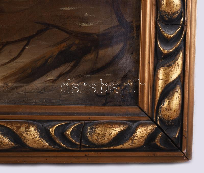 Jelzés nélkül, feltehetően XIX. sz. festő: Vaddisznót támadó kutyák. Olaj, vászon. Javított. Sérült. Dekoratív fakeretben, 55,5x69 cm