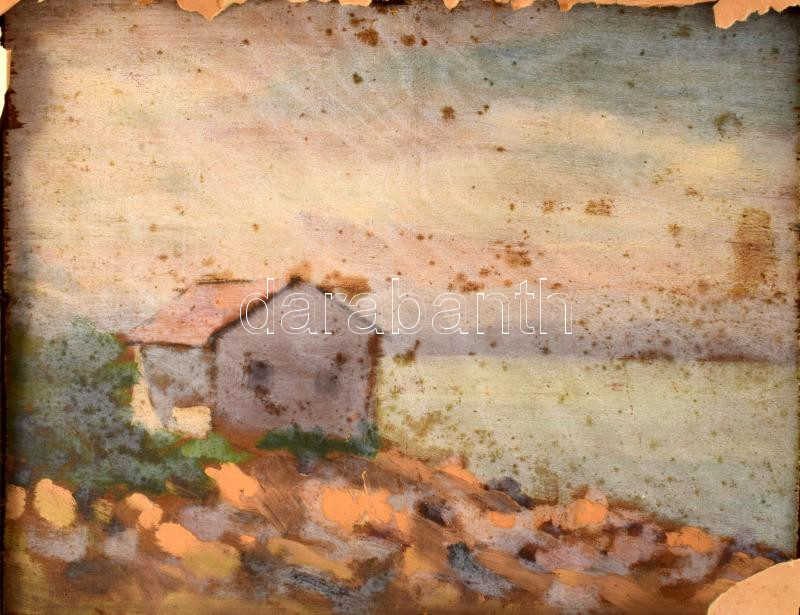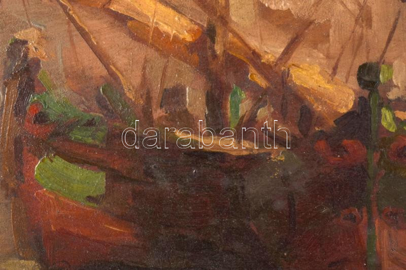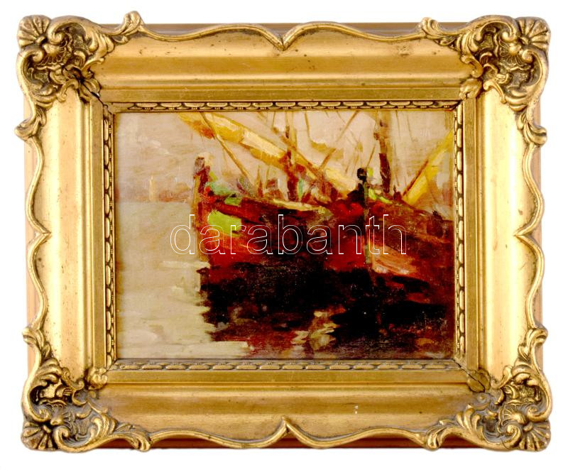 Paczolay jelzéssel, XX. sz .első fele: Kikötőrészlet vitolrásokkal (kétoldalas mű, hátoldalán tájrészlet). Olaj, fa. Dekoratív fakeretben, 18×24 cm