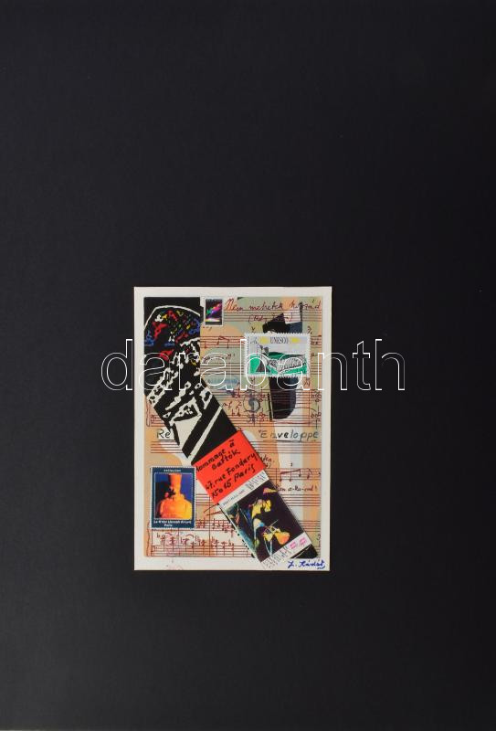 Description: Joseph Kadar (1936-2019): Hommage a Bartók (mail art mű). Vegyes technika, nyomat, kollázs, papír, jelzett. Kartonra kasírozva. Joseph Kádárnak címezve. Joseph Kadar gyűjteményi bélyegével és bélyegzésével. 17x11 cm