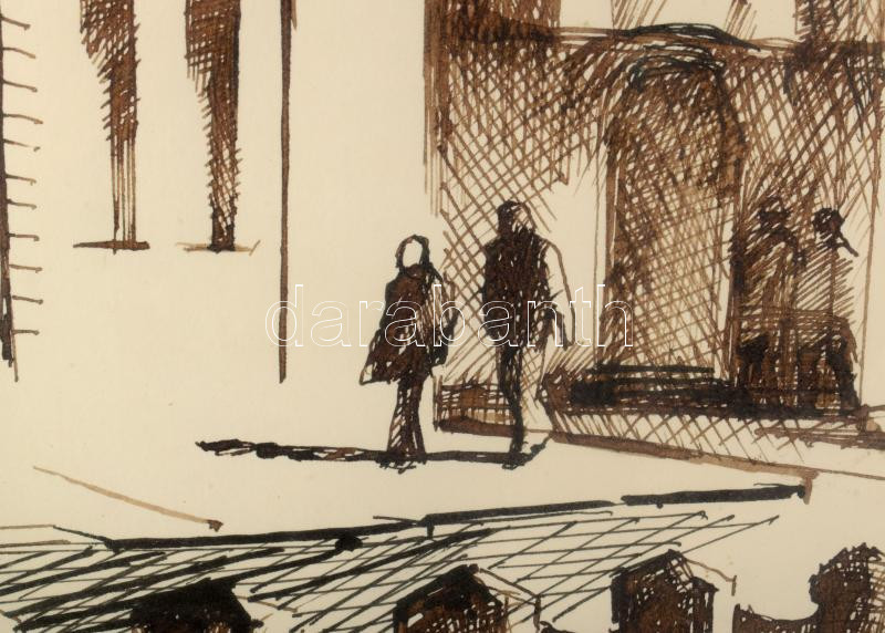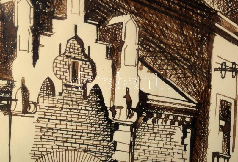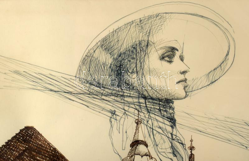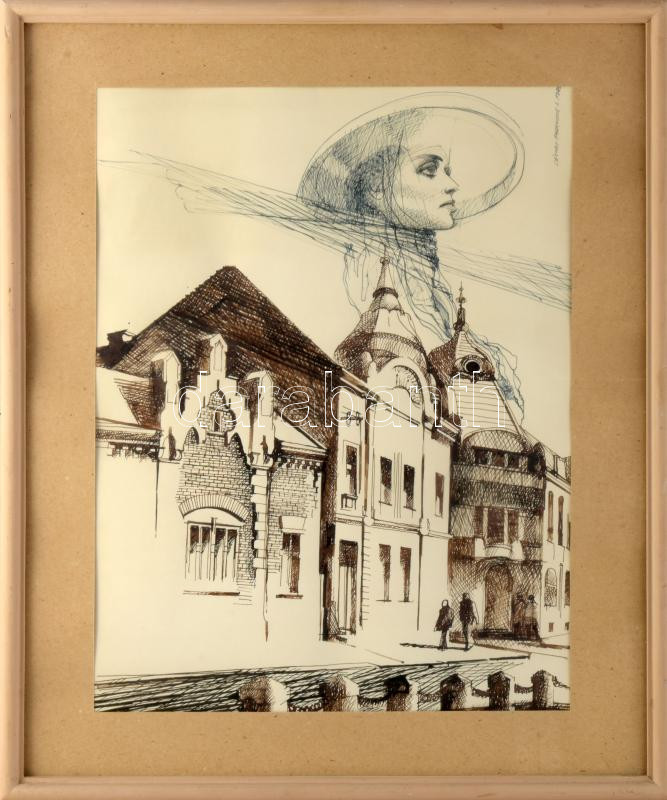 Paulovics László (1937-2024): Angyal a város felett (cím nélkül), 1985. Tus, toll, papír, jelzett. 39x29 cm. Üvegezett fakeretben.