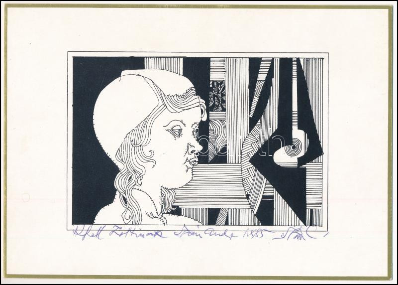 Description: Szász Endre (1926-2003): Női portré. Nyomat, papír. Jelzettt. Szász Endre autográf ajánlásával, 1984-ben Bécsben rendezett kiállítási meghívóján. 10×14 cm.