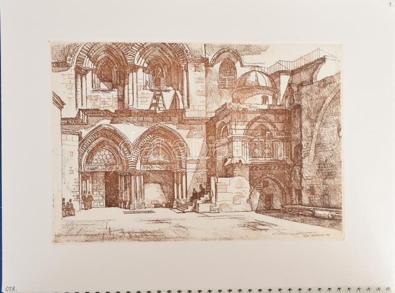 Zádor István 7 darab eredeti rézkarca Jeruzsálemről. Magyar nyelvű kiadás Számozott album. Szolnok, 1995. Viktoria Kft. 1 lev. 7 t. (rézkarcok, papíron). 14 hártyapapír előzékkel. A rézkarcokat sokszorosította Pataky Béla grafikusművész, az albumokat készítette Tarapcsik Sándor könyvkötészete, Kecskemét. Aranyozott, díszes egészvászon mappában. Számozott (078.) példány.