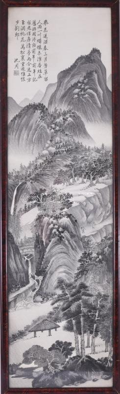 Olvashatatlan jelzéssel, kínai alkotó, XX. sz. közepe: Vándorok a hegyek közt. Selyemkép. Üvegezett fakeretben. 92×26 cm