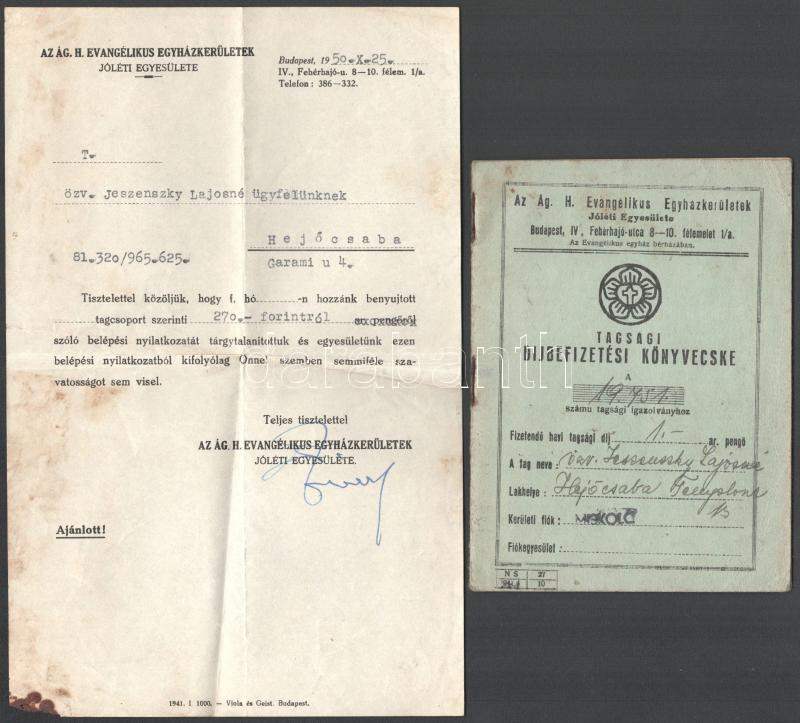 Description: 1942-1945 Az Ág. H. Evangélikus Egyházkerületek Jóléti Egyesülete tagsági díjbefizetési könyvecske, bélyegekkel + 1950 Az Ág. H. Evangélikus Egyházkerületek Jóléti Egyesületének levele özv. Jeszenszky Lajosné részére