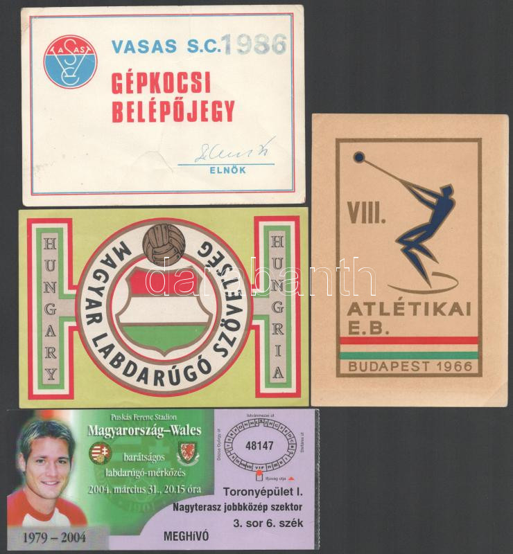 1986, 2004 Focival kapcsolatos belépőjegyek és matricák (Magyarország-Wales, Vasas SC, VIII. Atlétikai EB, Magyar Labdarúgó Szövetség)