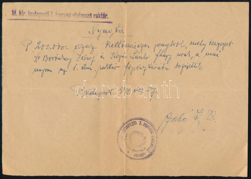 1944 Bp., M. kir. budapesti 1. honvéd élelmező raktár által kiállított nyugta a raktár főpénztárába befizetett 200.000P összegről