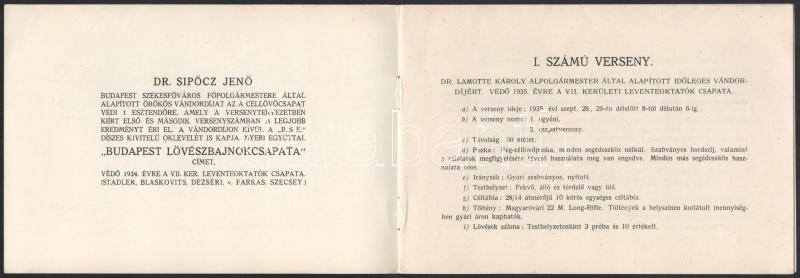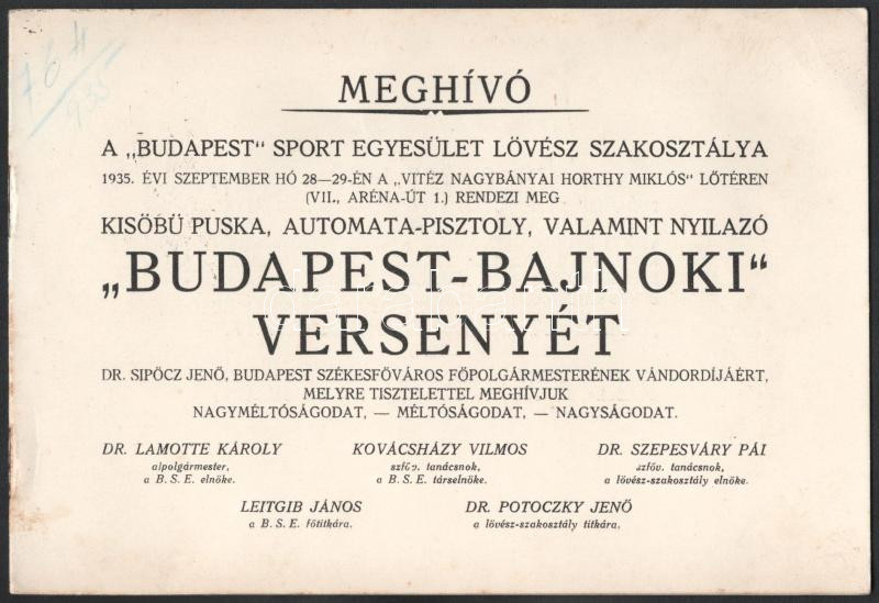 1935 A "Budapest" Sportegyesület meghívója a "Vitéz Nagybányai Horthy Miklós" lőtéren megrendezendő Budapest-bajnoki lövészversenyére, részletekkel, postán elküldve, jó állapotban, 8p