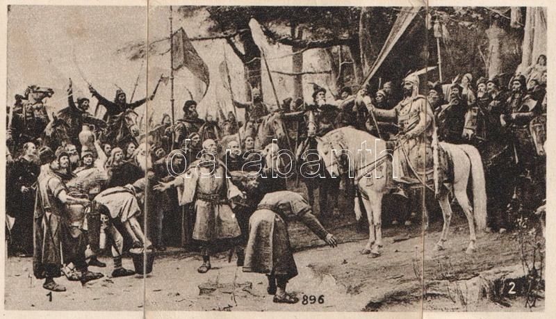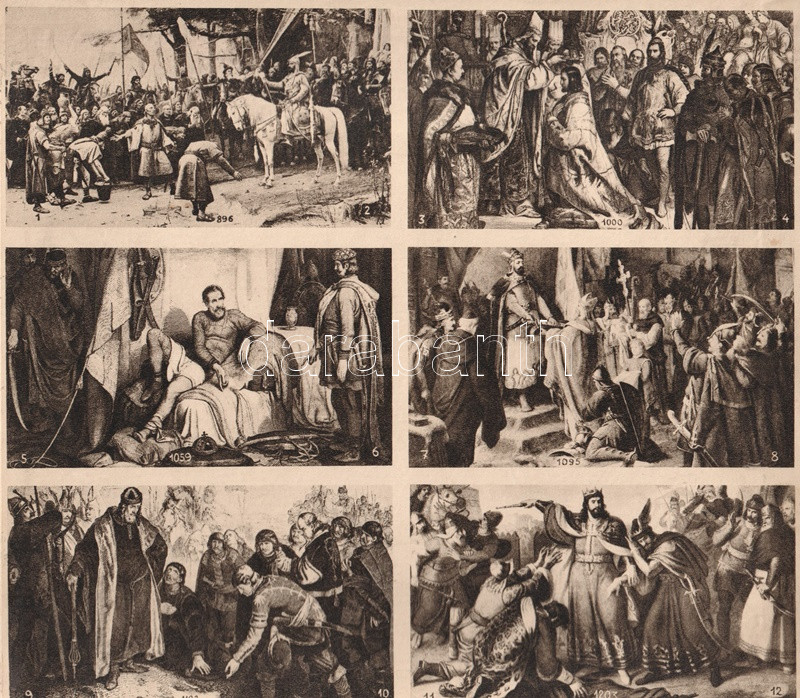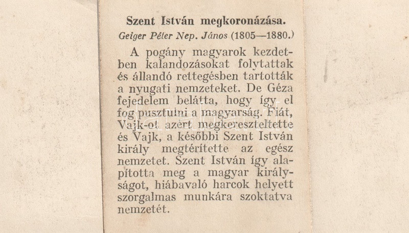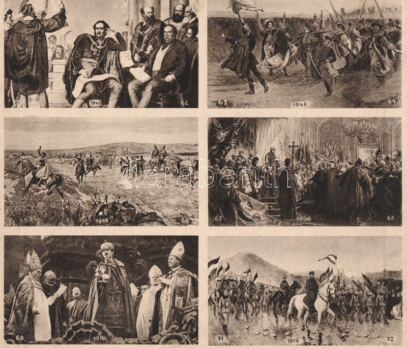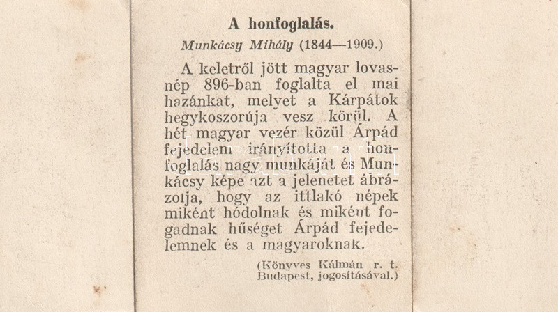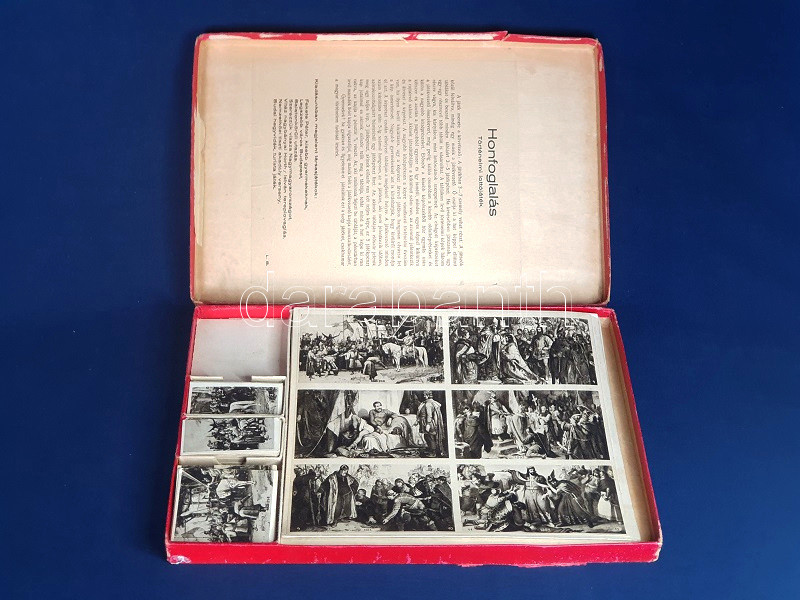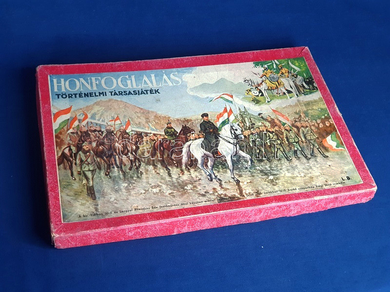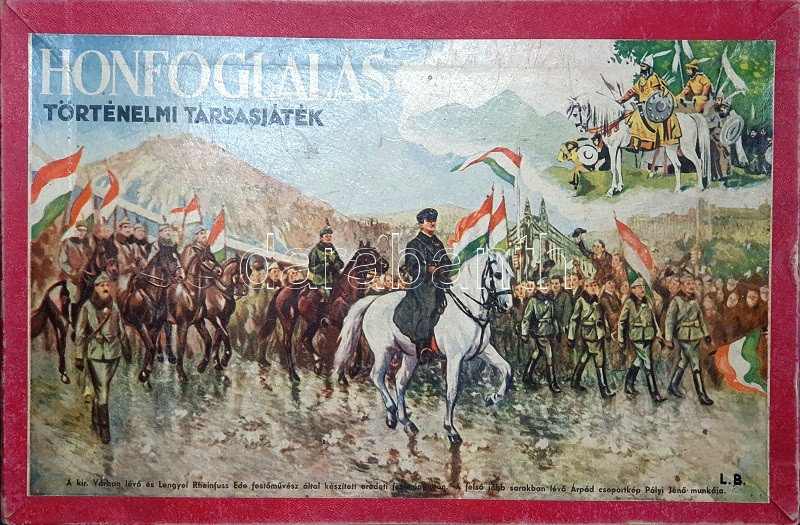 Műveltségi játékunk 1935 körül keletkezhetett, Lengyel-Rheinfuss Ede festőművész ugyanis ebben az évben készítette el "A nemzeti hadsereg bevonulása Budapestre az 1919-es kommün leverése után" című történelmi festményét, mely a Gellérthegy, a Ferenc József híd és a Vár előterében lovagló Horthy Miklóst ábrázolja, lobogókat hordozó katonái, valamint ünneplő tömeg kíséretében. A játék maga a magyar történelem jelentős eseményeit jeleníti meg historista festőművészeink (Than Mór, Székely Bertalan, Madarász Viktor, Benczúr Gyula) tolmácsolásában. A játéktáblákon 6-6 történelmi festmény fekete-fehér reprodukciója szerepel, a játékkártyákon pedig e 36 festmény összesen 3x36 részlete, középső darabjukon az ábrázolt esemény bőségesebb, hazafias és erkölcsnemesítő stílusban megfogalmazott magyarázatával. A lottójáték formájában megalkotott társasjáték a magyar történelem 36 jelentős eseményének memorizálására szolgál, egyfajta licitrendszer segítségével; dobozolt példányunk a színes dobozt, a játéktáblákat és a játékkártyákat hiánytalanul tartalmazza, a játékzsetonok azonban hiányoznak. Játékszabály a doboz belsejében, végén a névtelenül maradó szerző egyéb játékainak listájával, melyek között a "Legszebb város Budapest", a "Balaton körüli utazás", a "Szerezzük vissza Nagymagyarországot" és a "Vitéz nagybányai Horthy István díjlovaglás" edukatív játékcímek is feltűnnek.