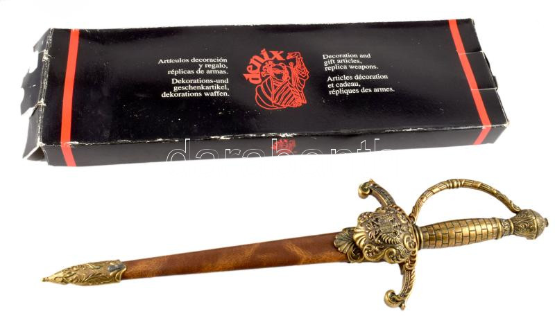 Denix fantázia tőr, tömör fém markolattal, kétfejű sasos címer díszítéssel, hüvellyel, h: 45 cm