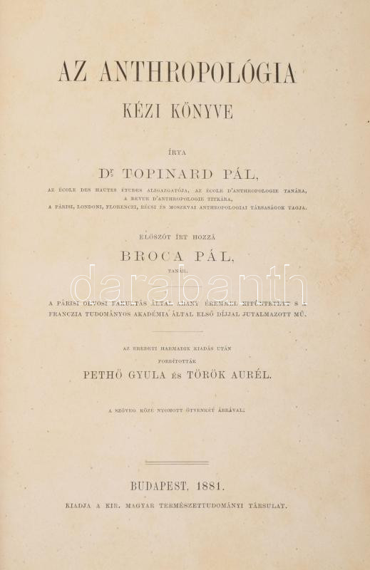 Dr. Topinárd Pál: Az anthropológia kézi könyve. Bp., 1881, Kir. Magyar Természettudományi Társulat. Kiadói dombornyomott egészvászon kötés, festett lapélek, kopottas állapotban.