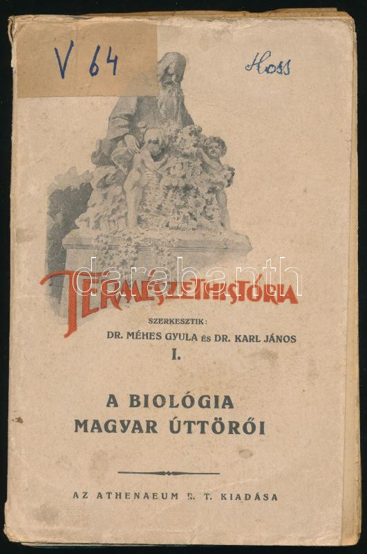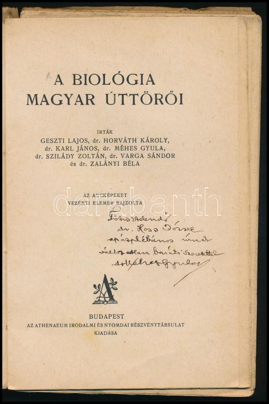 Méhes Gyula et al.: A biológia magyar úttörői. Természethistória I. Az egyik szerző, Dr. Méhes Gyula (1897-1970) orvos, farmakológus, egyetemi tanár által Hoss József (1881-1969) katolikus pap, pápai prelátus, címzetes apát, országgyűlési képviselő részére dedikált példány. (A borítón valószínűleg Hoss József autográf névbejegyzésével). Bp., [1925], Athenaeum, 236 p. Egyetlen kiadás. Kiadói papírkötés, viseltes, széteső állapotban, kissé foltos borítóval, sérült gerinccel, helyenként foltos lapokkal, a lapok többsége kijár.