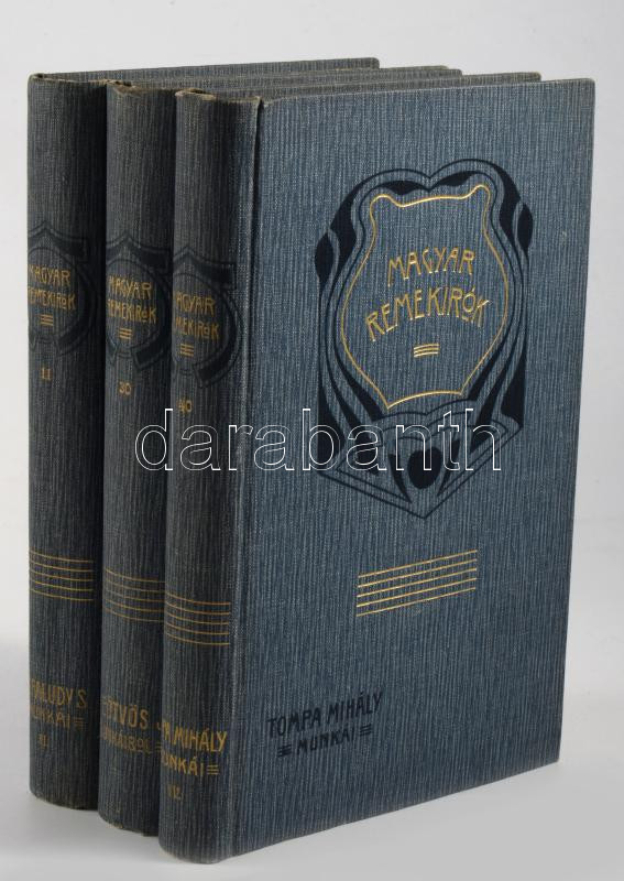 Magyar Remekírók sorozat 3 kötete: Tompa Mihály munkái. Sajtó alá rend. és bevezetéssel ellátta: Lévay József. IV. köt. Népregék. Virágregék.; Báró Eötvös József munkáiból. Sajtó alá rend. és bevezetéssel ellátta: Voinovich Géza. I. köt. Szépirodalmi művek.; Kisfaludy Sándor munkái. Sajtó alá rend. és bevezetéssel ellátta: Heinrich Gusztáv. II. köt. Regék. Bp., 1905, Franklin-Társulat. Kiadói aranyozott, szecessziós egészvászon sorozatkötés, Gottermayer-kötés, nagyrészt jó állapotban.