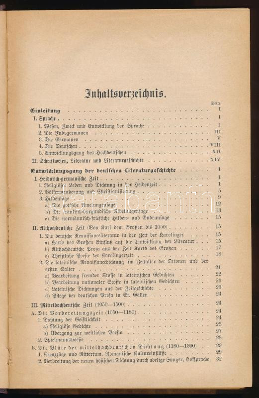 Description: Prosch, Franz: Leitfaden der deutschen Literaturgeschichte für den Unterricht in den oberen Klassen der österreichischen Mittelschulen. Wien, 1914, Kral Graefer & Kie., XIII+(1)+XVII+(1)+390 p. Második kiadás. Német nyelven. Kiadói félvászon-kötés, helyenként kissé foltos lapokkal, tulajdonosi bélyegzőkkel.