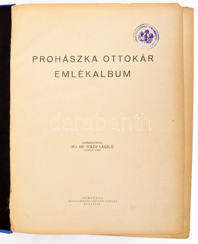 Prohászka Ottokár emlékalbum. Szerk.: ifj. Toldy László. Bp., [1927], Mercedes, 3 sztl. lev.+ 212 p.+ 55 p.+ 2 sztl. lev. Egyetlen kiadás. Oldalszámozáson belül egészoldalas, fekete-fehér képekkel. Kiadói aranyozott egészvászon-kötés, a címlapon kis lapszéli szakadással, régi intézményi bélyegzőkkel.
