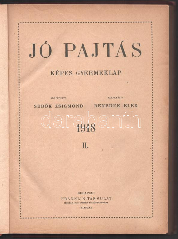 1918 Jó Pajtás képes gyermeklap 1918. évf. II. köt. Szerk.: Benedek El... https://www.darabanth.com/en/508-Online-auction/508.0/Books/Books-Tales~759/1918-Jo-Pajtas-kepes-gyermeklap-1918-evf-II-kot-Szerk-Benedek-Elek-Bp-Franklin-Tarsul~II3441343