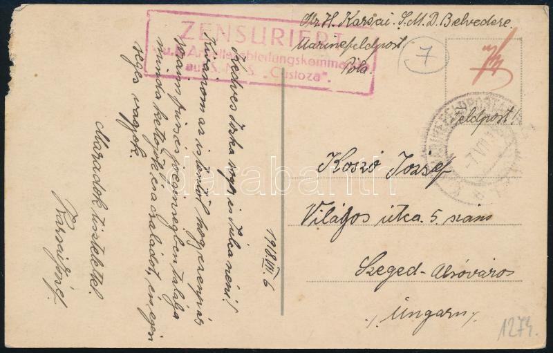 1918 Tábori posta képeslap / Field postcard "S.M.S. CUSTOZA"
