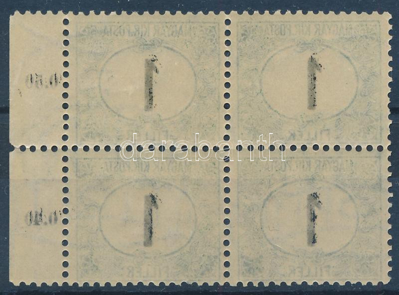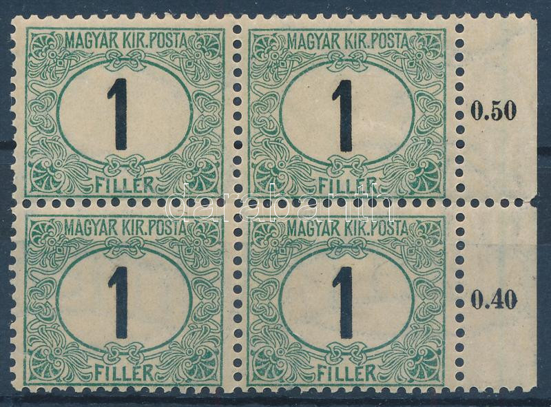 Description: 1903 Zöldportó 1f ívszéli négyestömb 11 3/4 : 12 fogazással, felül halványan látszódó számvízjellel és az értékszámok gépszínátnyomatával / Mi P 1 A block of 4, pale number in the watermark and machine offset
