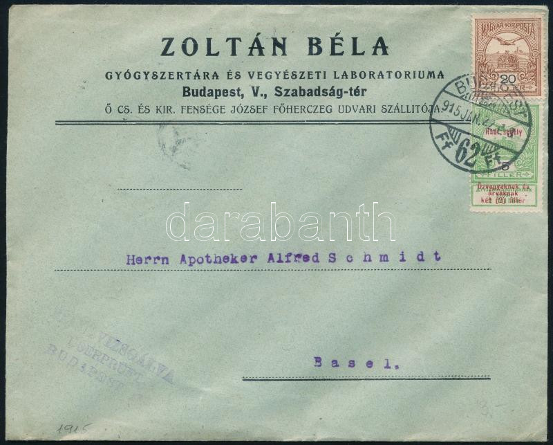 1915 Levél Turul 20f + Hadisegély 5f bérmentesítéssel, budapesti cenzúrával Svájcba