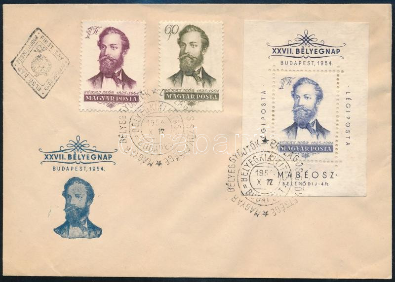 https://www.darabanth.com/en/508-Online-auction/508.0/Hungarian-philately-and-postal-history/Issues-between-1946-1956~50/1954-Belyegnap-Jokai-Mor-sor-plus-blokk-FDC-n~II3441631