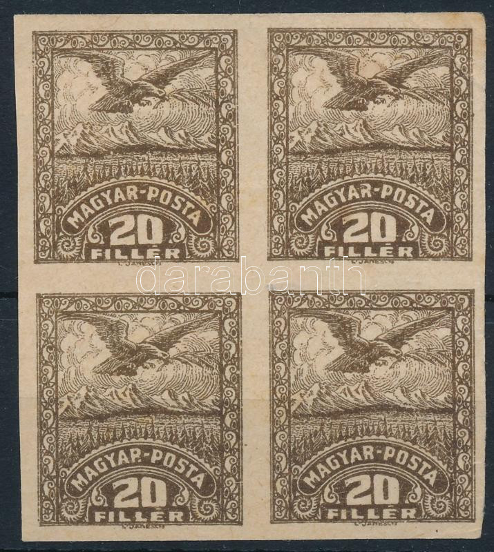 Debrecen II. 1920 20f próbanyomat vágott 4-es tömbben, Bodor vizsgálójellel (sérül sarok / folded corner)