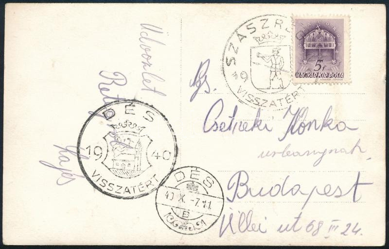 1940 Képeslap "SZÁSZRÉGEN VISSZATÉRT" és "DÉS VISSZATÉRT" bélyegzésekkel