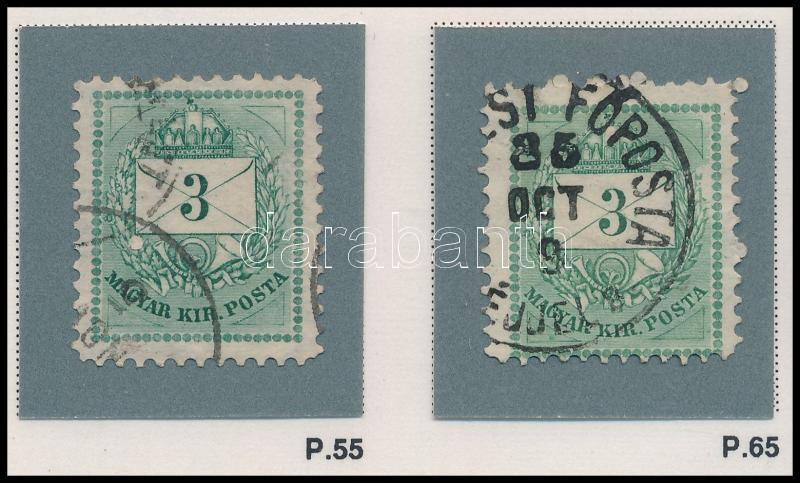1881 2 db 3kr klf vésésjavításokkal, karcokkal, hidegtűnyomokkal (ex Orbán, Sebestyén aranyérmes kiállítási anyagból)