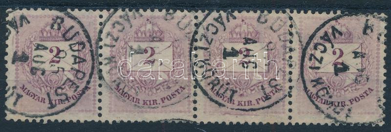 1881 2kr négyescsík, balról a 3. bélyegen javítás a kürt alatt, lent karc (ex Lovász)
