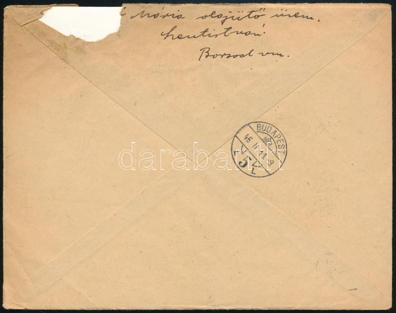 1946.02.07. (7. díjszabás) Ajánlott levél Szentistvánról Budapestre kü...
