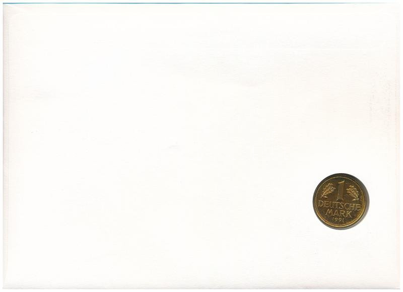 Description: Németország 1991D 1M aranyozott Cu-Ni, tartományi címereket ábrázoló bélyeggel felbélyegzett "BERLIN " borítékban, bélyegzéssel, német nyelvű leírással T:UNC
