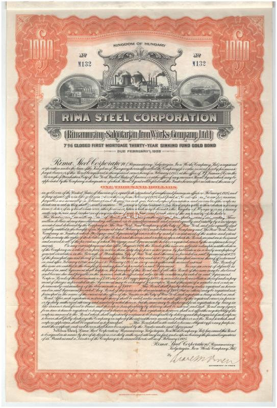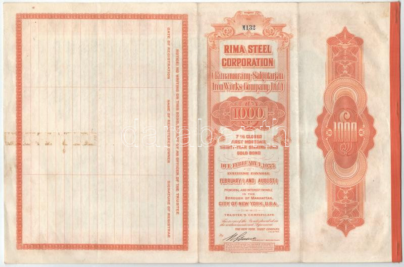Description: Amerikai Egyesült Államok / New York / Magyarország 1925. "Rimamurány-Salgótarjáni Vasmű Rt. " 7%-kal kamatozó arany kötvény 1000$-ról szelvényekkel T:F USA / New York / Hungary 1925. "Rima Steel Corporation - Rimamurány-Salgótarján Iron Works Company, Ltd. " 7% gold bond about 1000 Dollars with coupons C:F