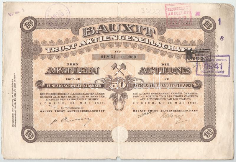 Description: Svájc 1923. Zürich "Bauxit Tröszt Részvénytársaság " tíz darab részvénye egyben, egyenként 50Fr-ról bélyegzésekkel, szelvényekkel, szárazpecséttel T:F