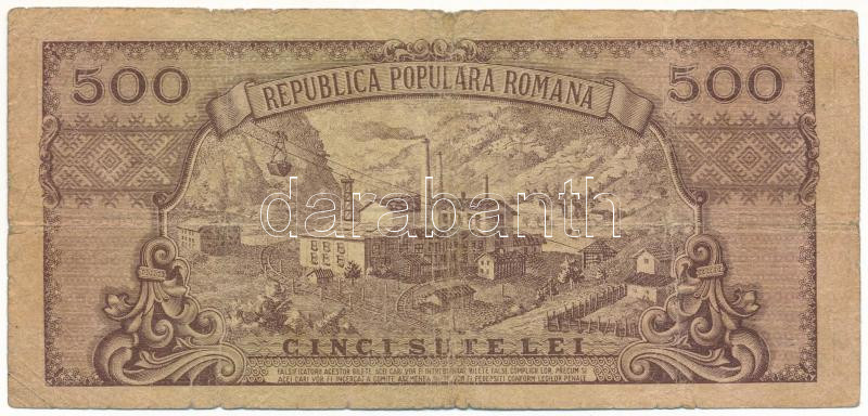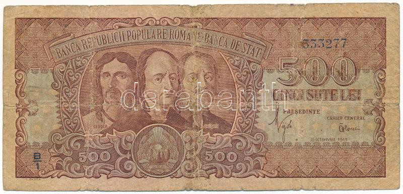 ... https://www.darabanth.com/en/508-Online-auction/508.0/Numismatics/Worldwide-banknotes~842/Romania-1949-500L-B1-333277-T-VG-kozepso-hajtas-menten-pici-lyukRomania-1949-500-Lei-B1~II3442635