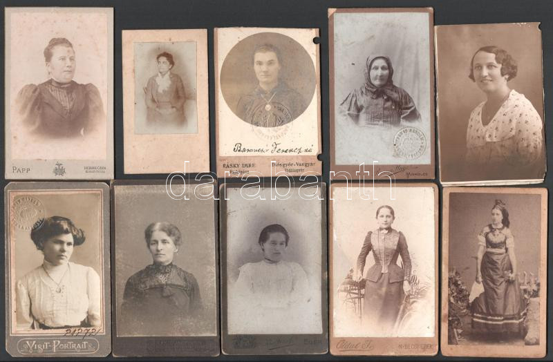 Description: 10 db hölgyeket ábrázoló vizitkártya, különféle műtermekből (közte Rásky Imre, Diósgyőr-Vasgyár; Papp Albert, Debrecen; Oldal István, Nagybecskerek; stb.), közte MÁV igazolványként használtak is, változó állapotban