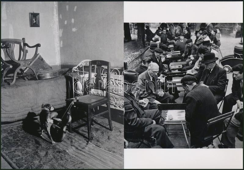 Description: cca 1952 Doisneau, Robert (1912-1994) francia fotóriporter és fotóművész felvételei (Kártyások; Muzikális kutya), 2 db modern nagyítás, jelzés nélkül, 21x15 cm