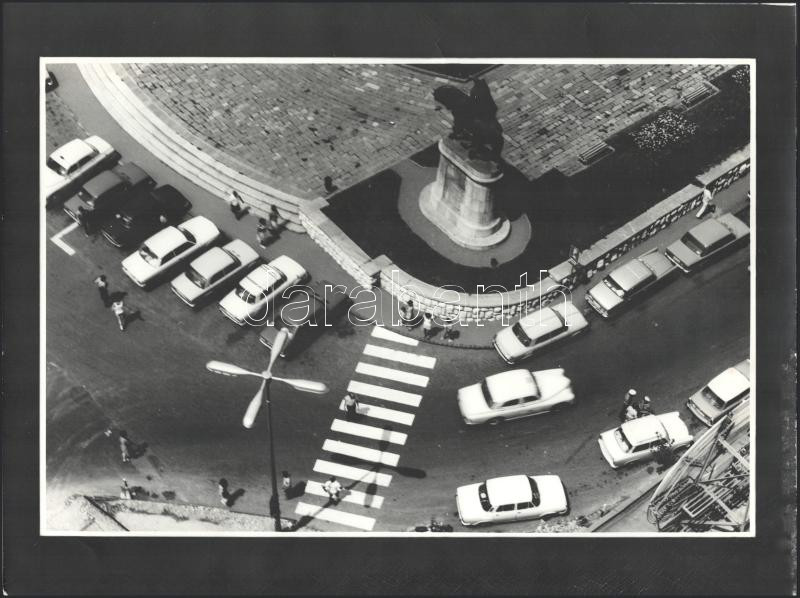 cca 1975 Pécs, Széchenyi téri részlet Hunyadi-szoborral és sok autóval, nagyméretű fotó felülnézetből, felületén törésnyomokkal, 30×40 cm
