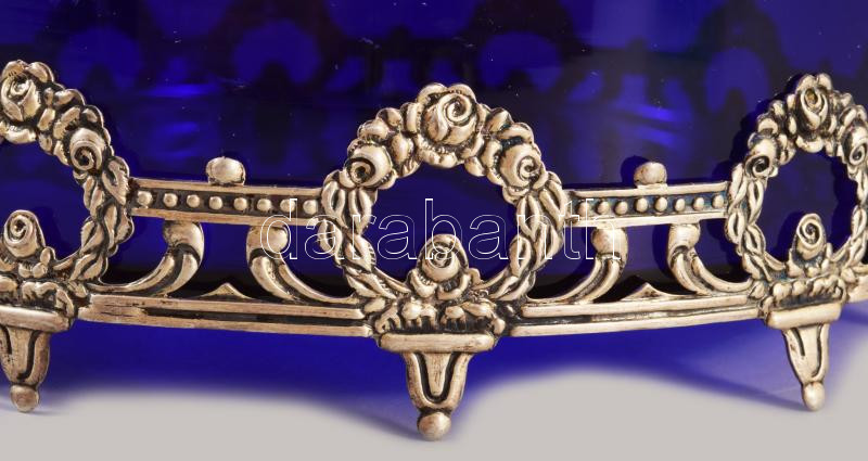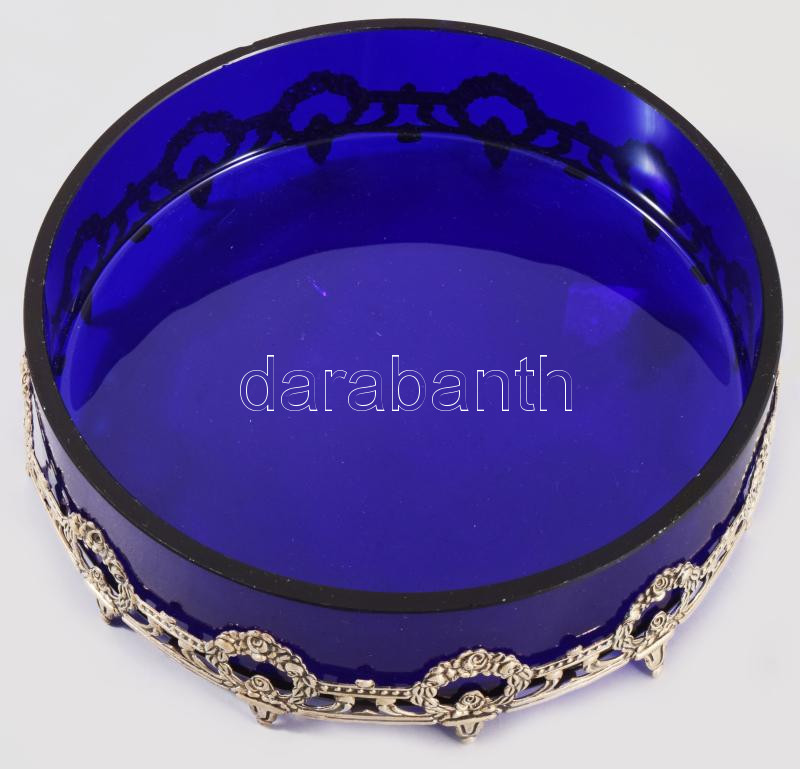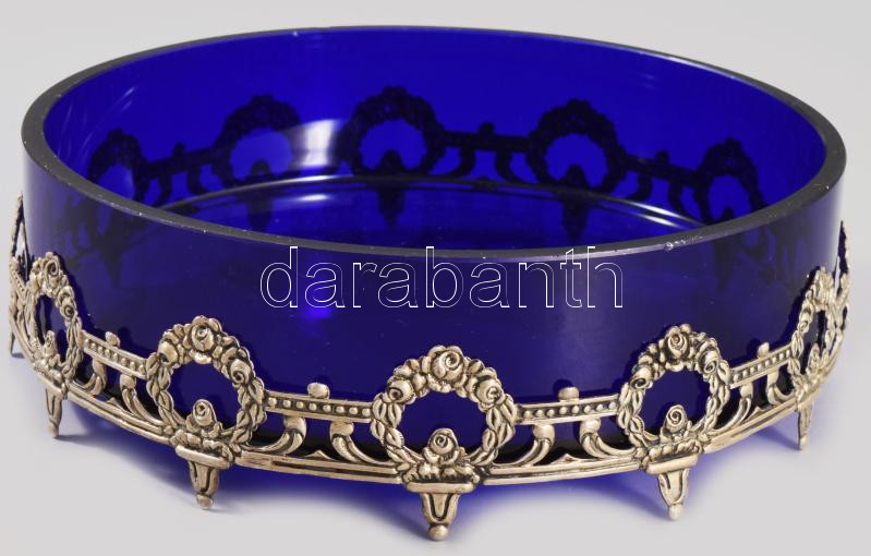 Királykék üveg kínáló, fém szerelékkel, hibátlan, d: 15 cm