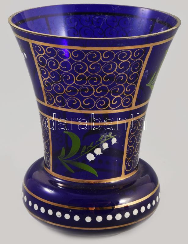 Parádi zománcfestett királykék váza, pattogzással, m: 14 cm