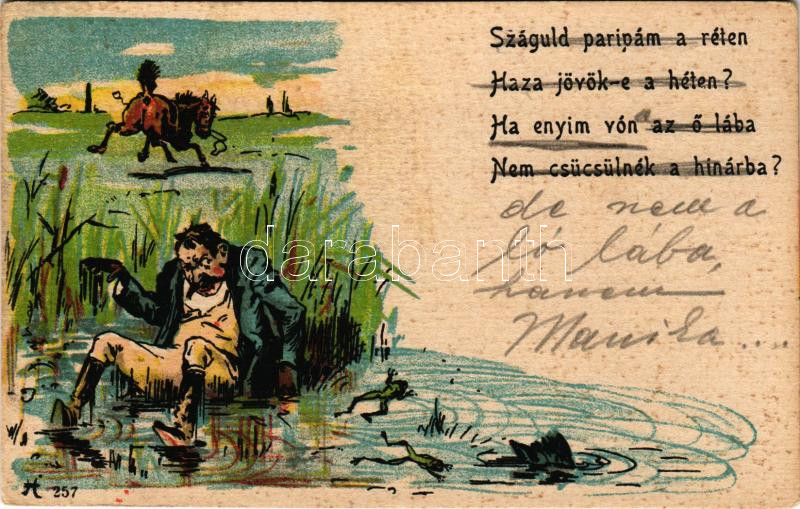 Description: Száguld paripám a réten, haza jövök-e a héten? Ha enyim vón az ő lába, nem csücsülnék a hínárba? / humour art postcard with riding accident, litho (fl)