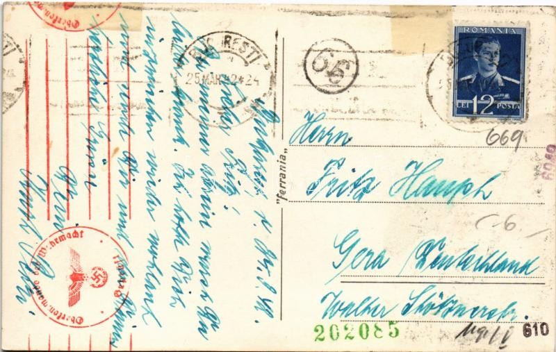 1942 Bucharest, Bucuresti; Universitate / university, trams, automobiles + "Oberkommando der Wehrmacht Geprüft" (glue marks)