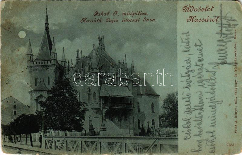 1900 Kassa, Kosice; Jakab A. műépítész Kossuth Lajos utcai háza este holdfényben. Vitéz A. kiadása / architect's villa (kopott sarkak / worn corners)