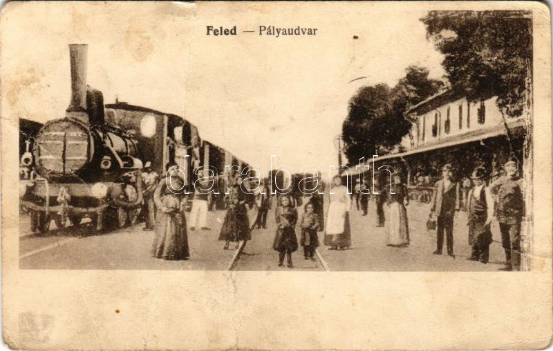 Feled, Veladín; pályaudvar, vasútállomás, gőzmozdony, vonat. Vasúti le...