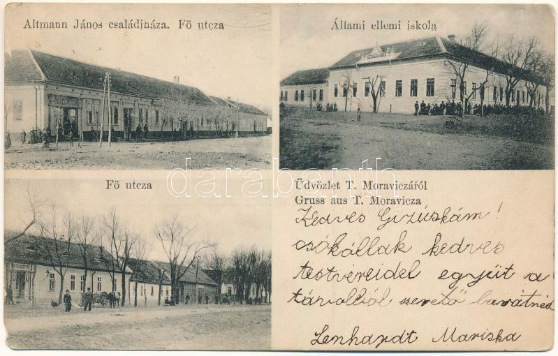 1907 Temesmóra, T. Moravicza, Moravita; Altmann János családi háza, Altmann József üzlete, Fő utca, Állami elemi iskola, gyógyszertár / shops, main street, elementary school, pharmacy (b)