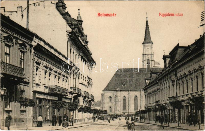 1911 Kolozsvár, Cluj; Egyetem utca, templom, Sámson Jakab üzlete. Lepa...