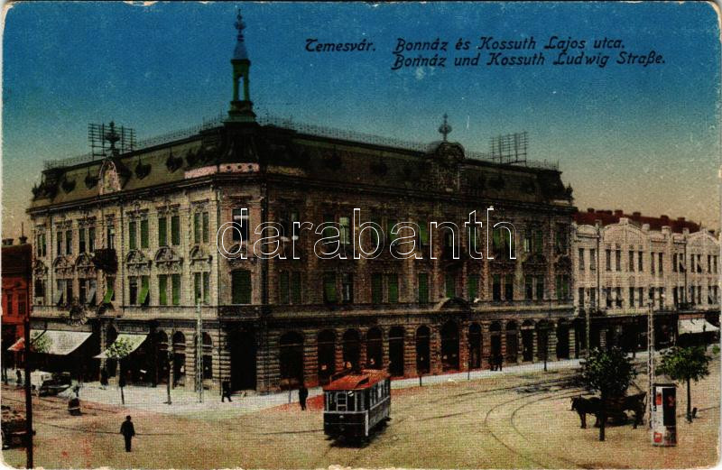 Temesvár, Timisoara; Bonnáz és Kossuth Lajos utca, villamos, üzletek. K. J. Bp. 1917/21. / street view, tram, shops (kopott élek / worn edges)