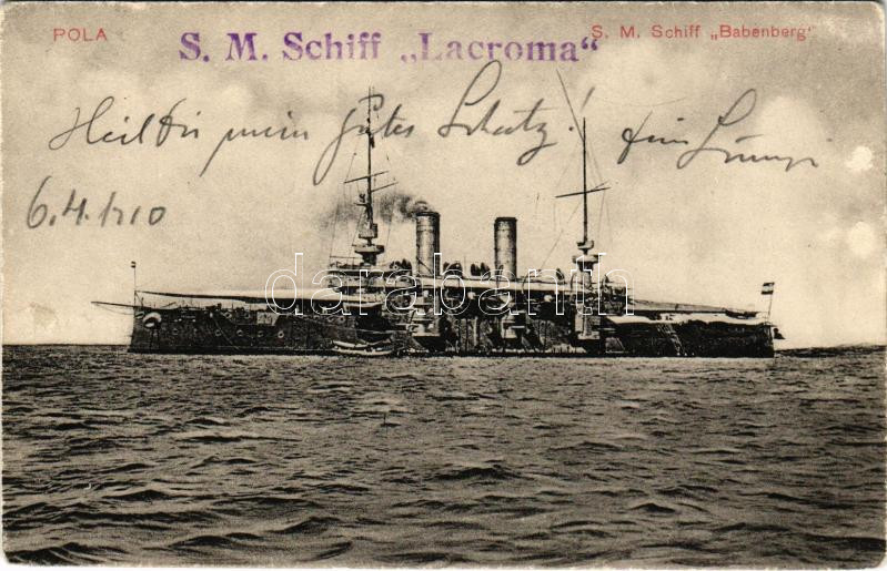 1910 Pola, Pula; SM Schiff Babenberg. K.u.K. Kriegsmarine. G. Costalunga 1909. / SMS BABENBERG az Osztrák-Magyar Haditengerészet Habsburg-osztályú pre-dreadnought csatahajója / Austro-Hungarian Navy SMS Babenberg pre-dreadnought battleship + "S.M. Schiff Lacroma" (kopott sarkak / worn corners)